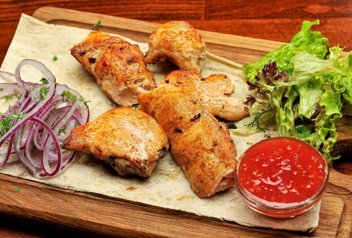 Подается на листе лаваша с маринованным лучком и соусом на ваш вкус