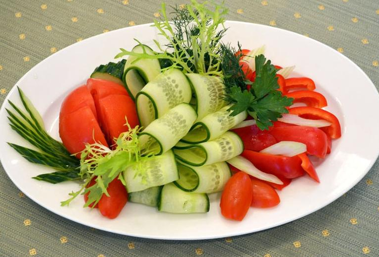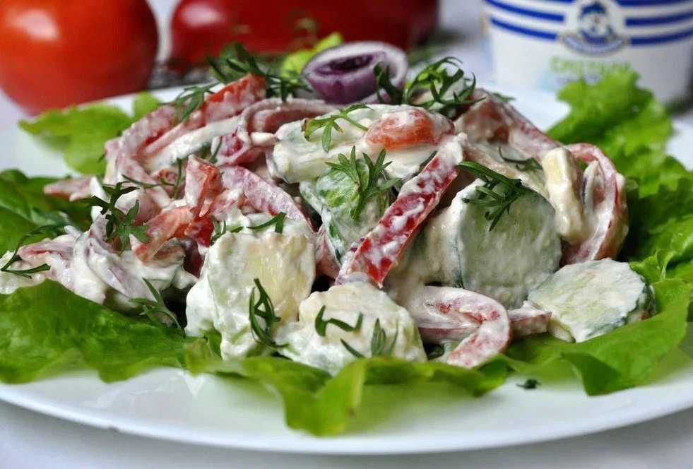 Ломтики огурчика, моркови и сладкого перца, подается со сметаной