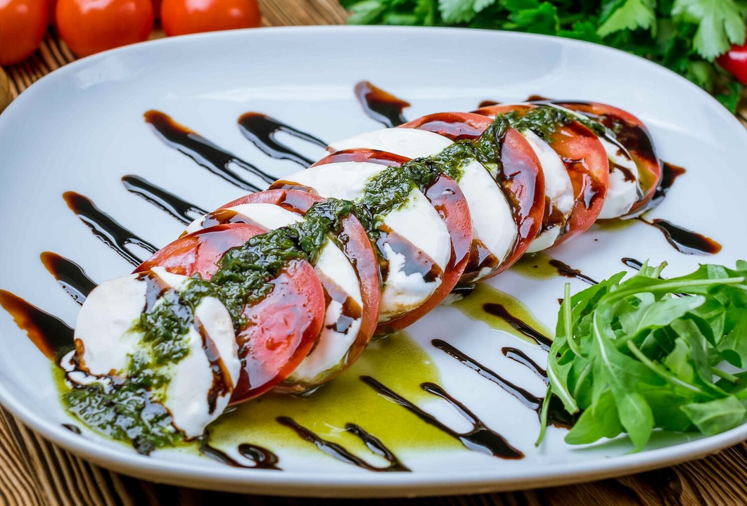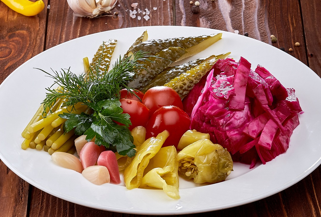 Помидоры черри, маринованные огурчики, перец и грибочки,