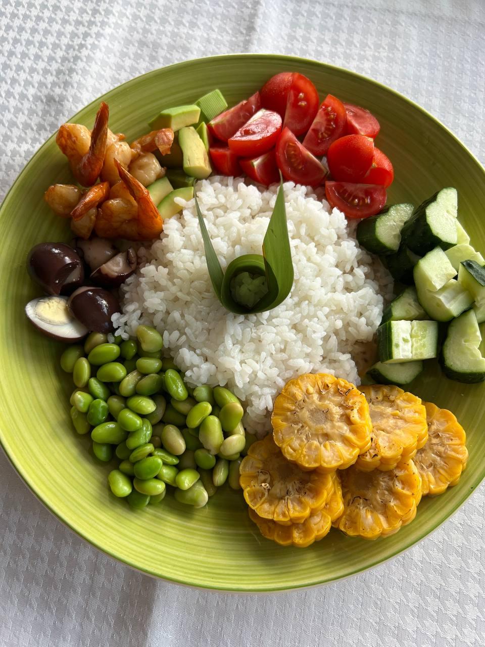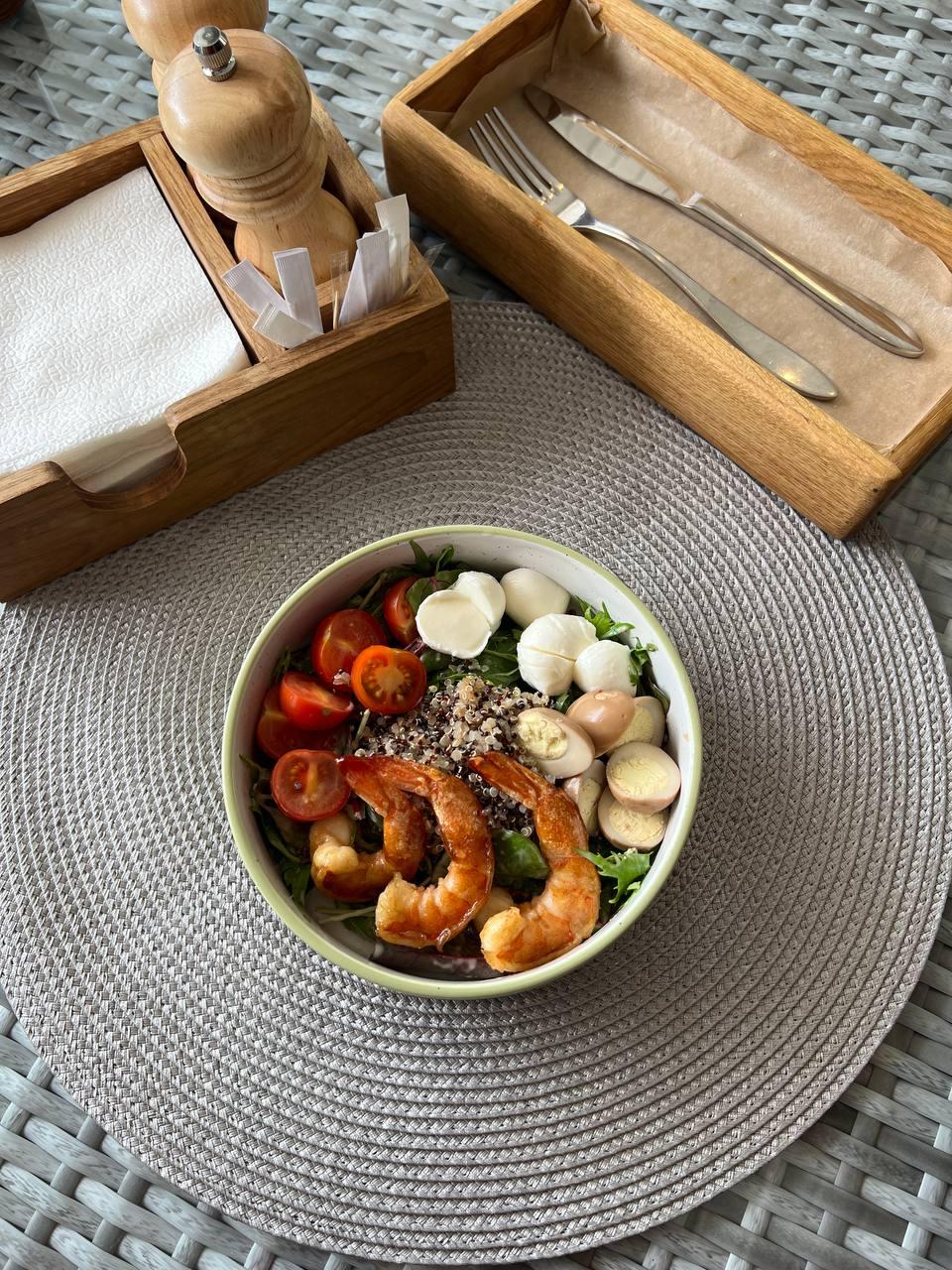 В составе: микс салата, креветки, киноа, мини моцарелла, черри, перепелиные яйца