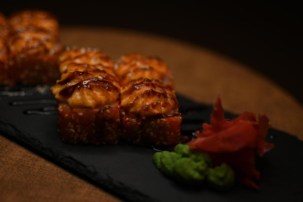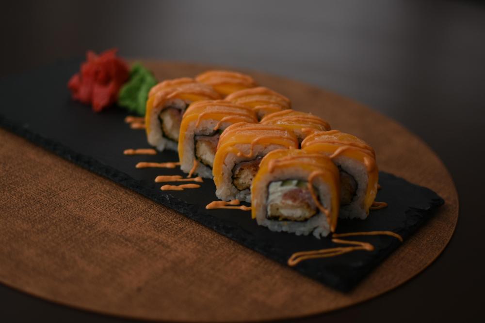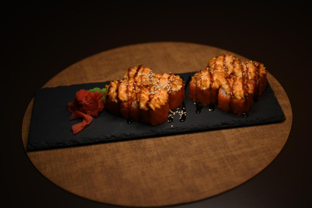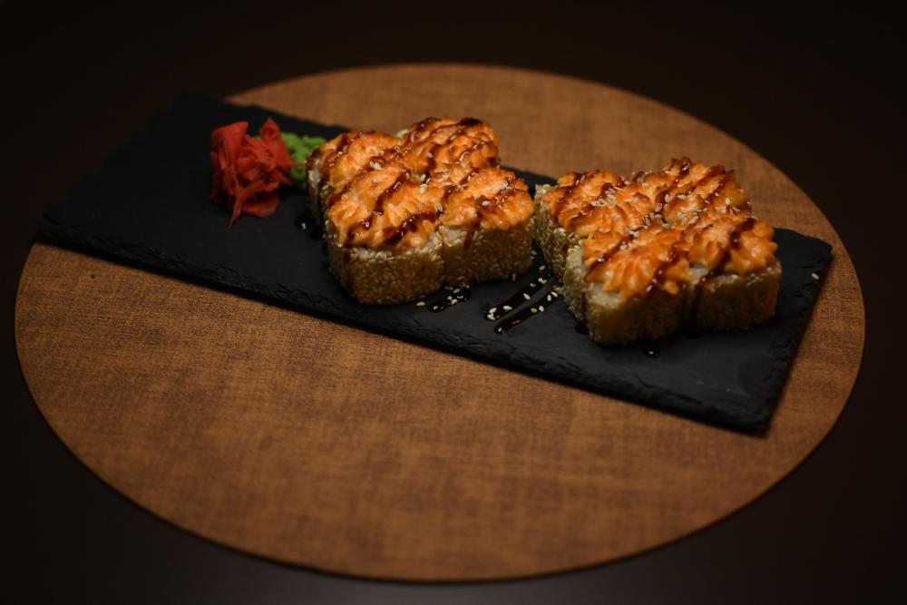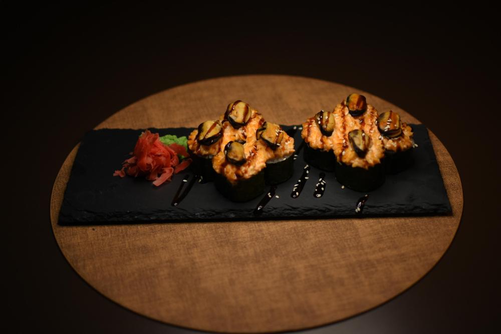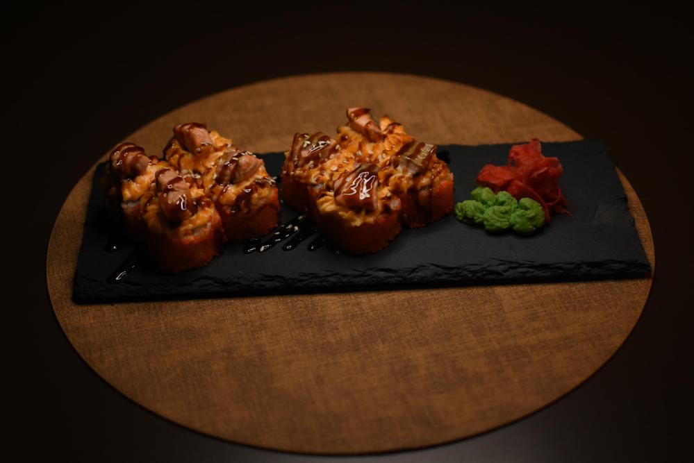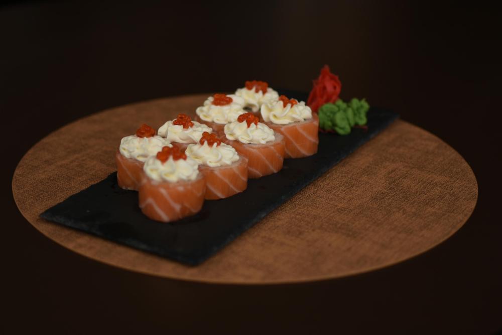 Рис, нори, сыр творожный, помидор Конкасе, лук зеленый, угорь, сырный соус, соус унаги, кунжут, икра масаго