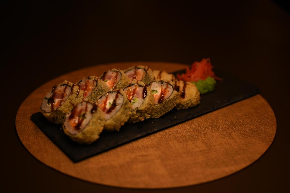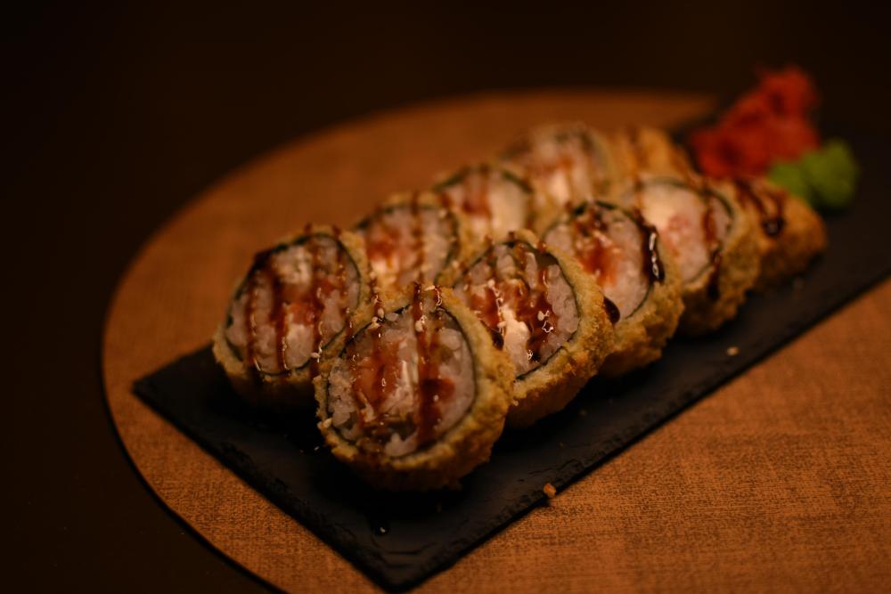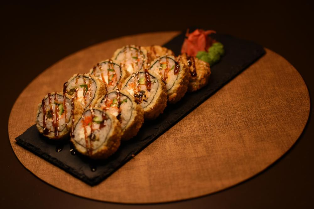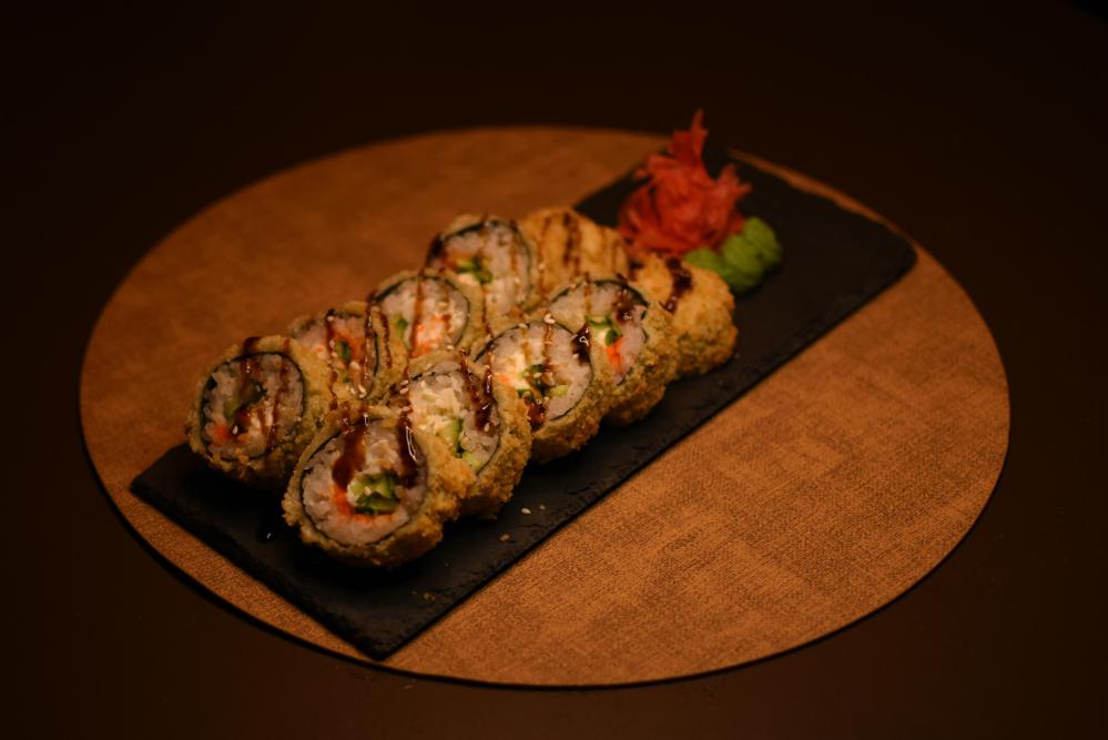 Рис, нори, сыр творожный, панировочные сухари, соус унаги, кунжут, тунец, лосось, огурцы, икра масаго