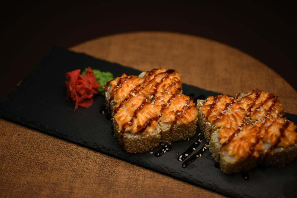Рис, нори, сыр творожный, огурцы, лосось, соус сырный, соус унаги, кунжут, икра масаго