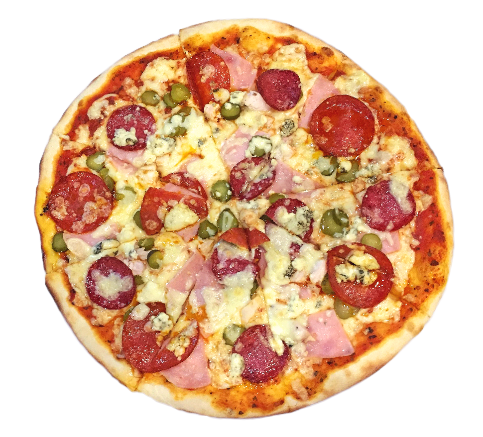 тесто фирменное, соус неаполитанский, сыр, грибы, ветчина, болгарский перец, помидоры, оливки