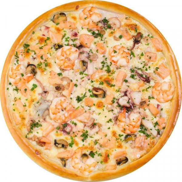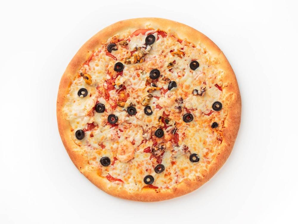 тесто фирменное, соус неаполитанский, сыр мацарелла, пармезан, дор блю, голландский, мидии, креветки, осьминог