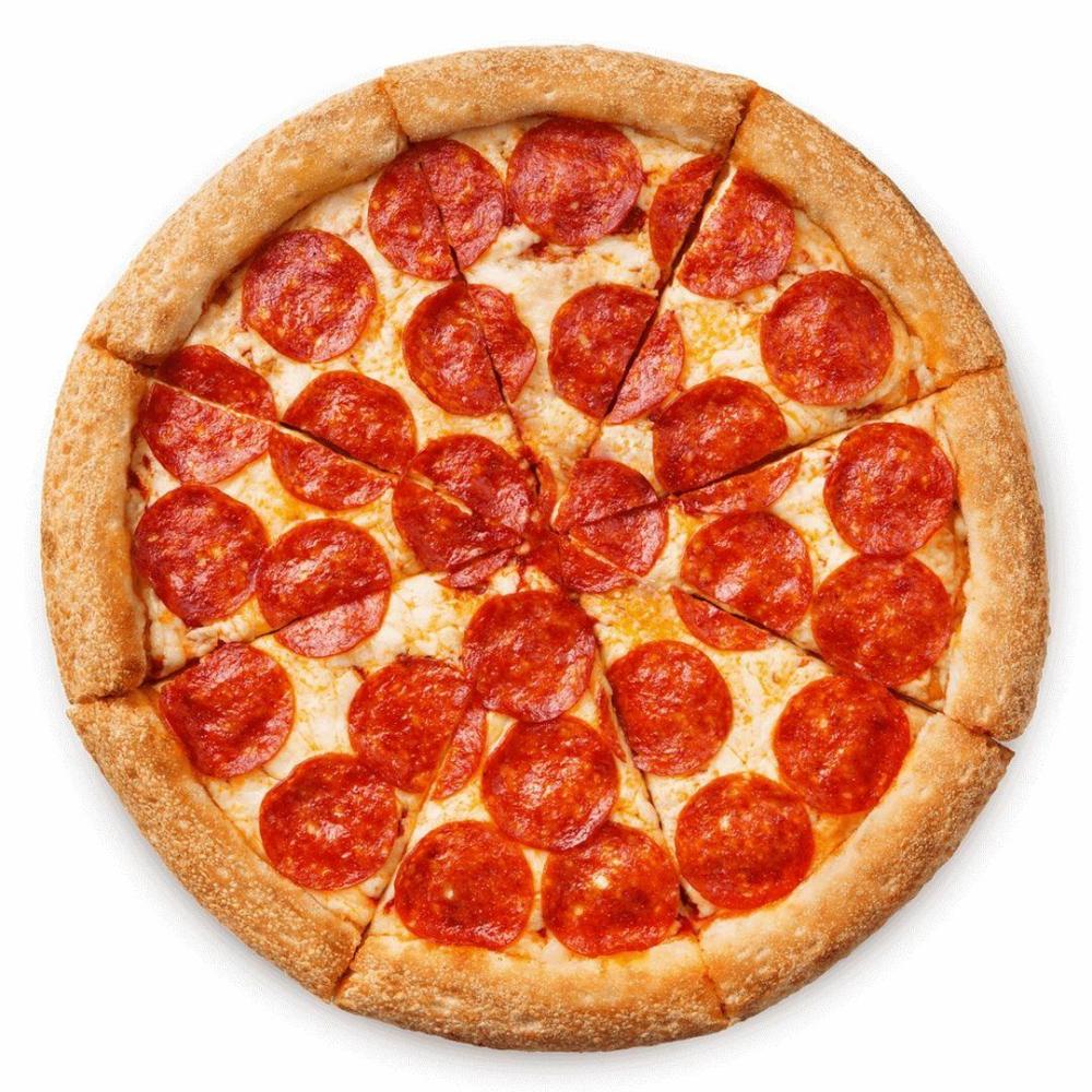 тесто фирменное, соус неаполитанский, колбаса пеперони, сыр, болгарский перец, оливки