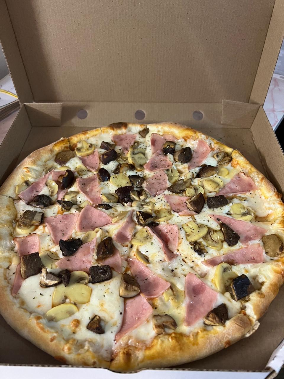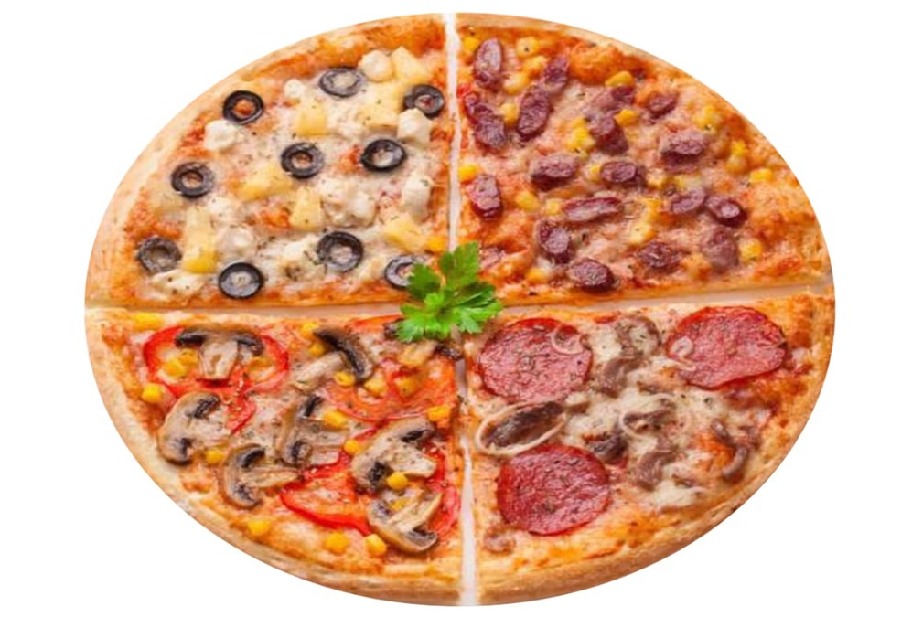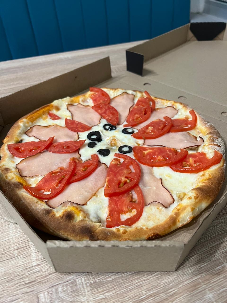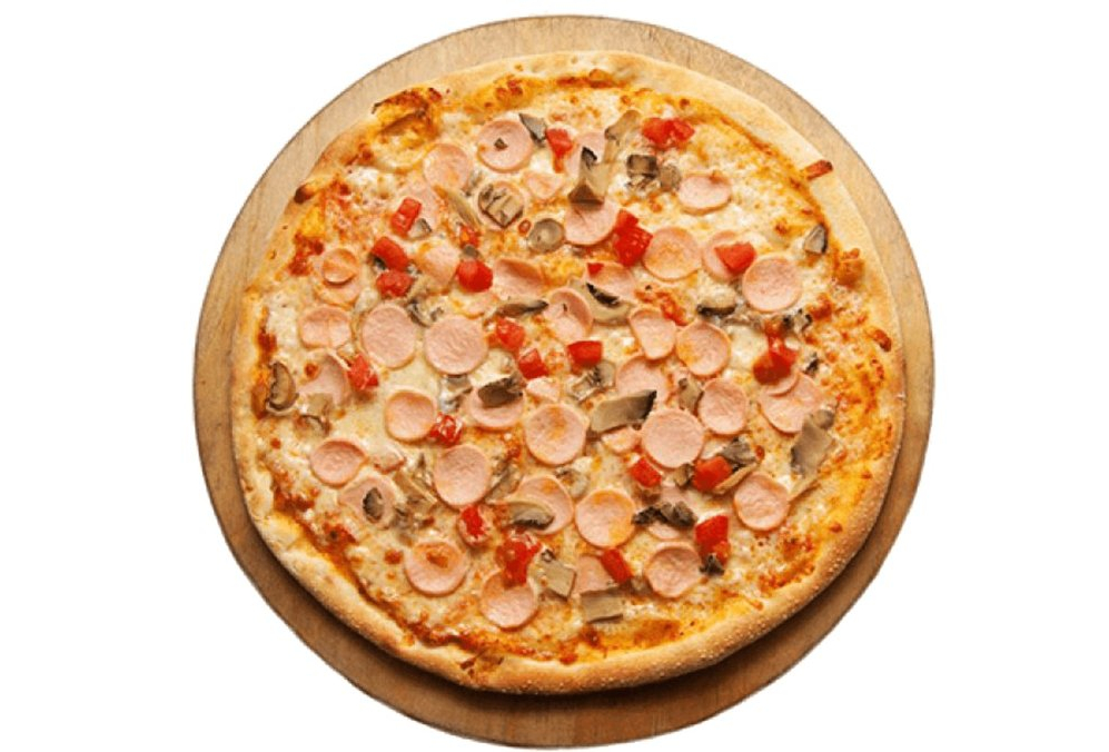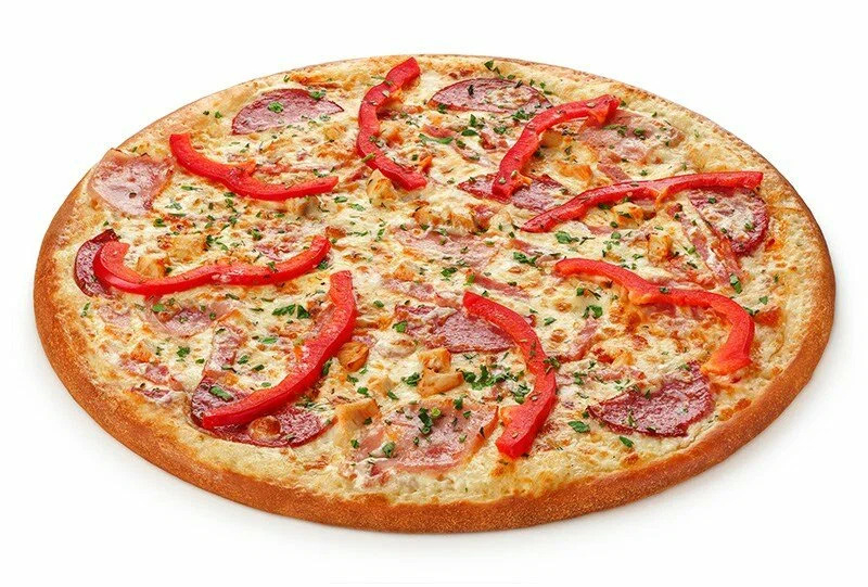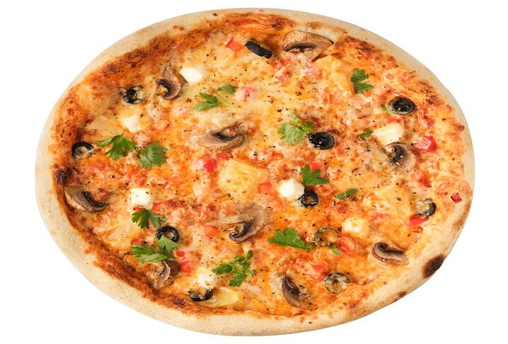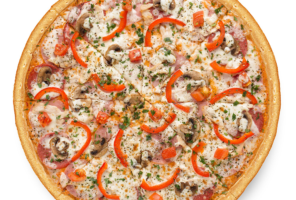 Ветчина, п/к колбаса, сыр, шампиньоны, помидоры, кукуруза, маслины, прованские травы