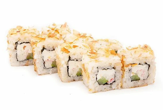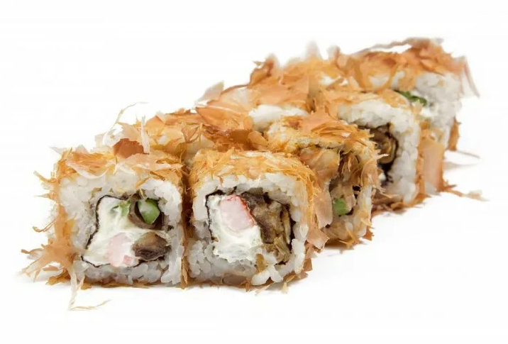 Угорь, огурец, слив. сыр, кунжут, соус терияки, стружка тунца