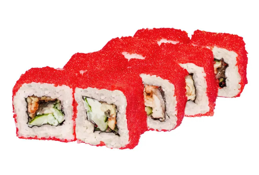 Угорь, лосось с/с, огурец, тобико, кунжут, сыр