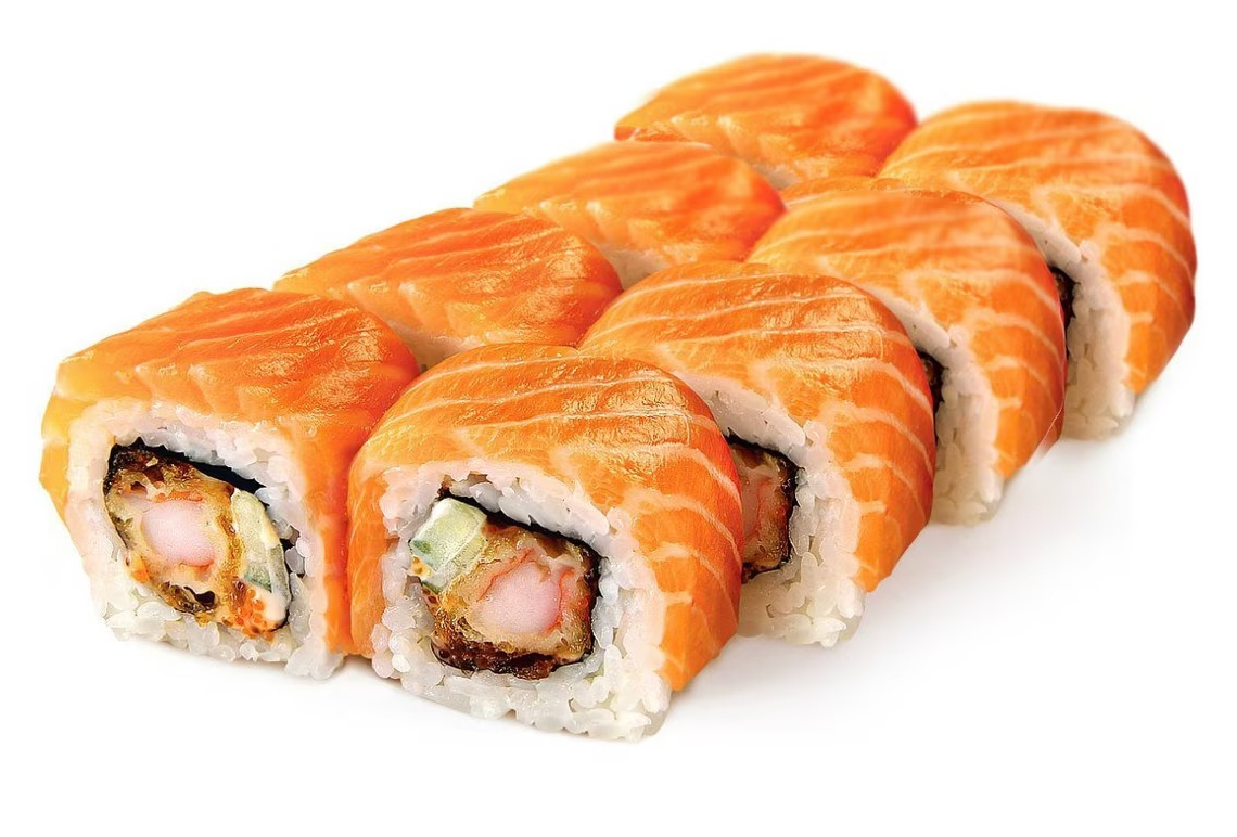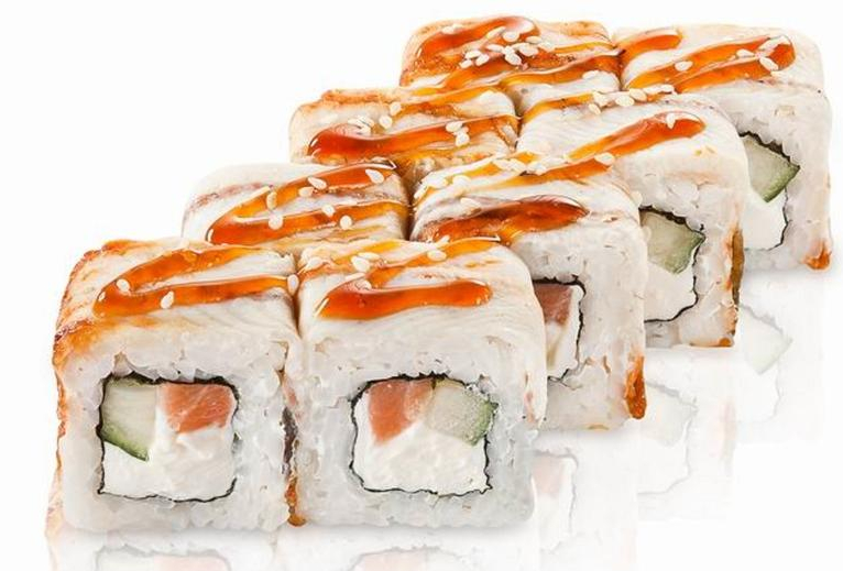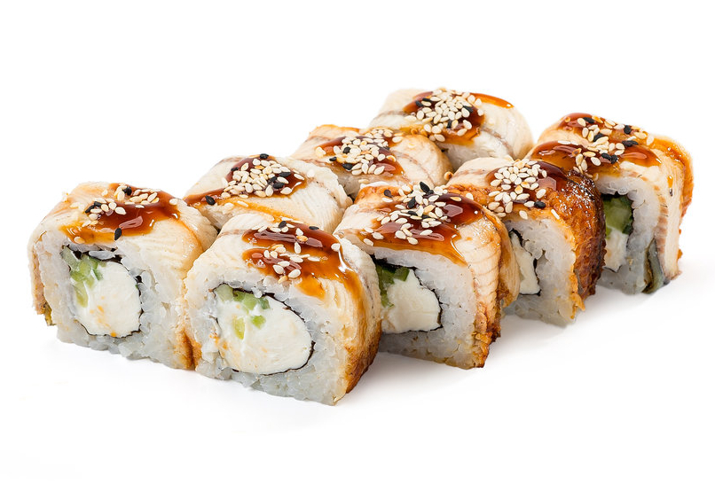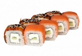 Лосось, угорь, слив.сыр, огурец, соус унаги, кунжут