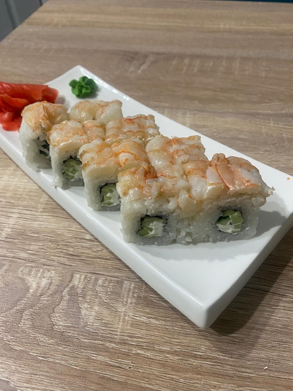 Тигровая креветка, огурец, слив. сыр, тобико, соус ореховый