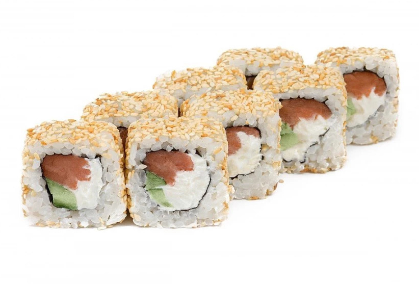 Лосось копченый, сыр, огурец, икра, кунжут, соус копчённый