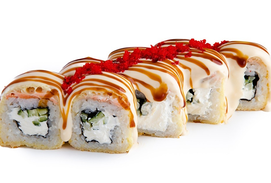 Снежный краб, огурец, слив. сыр, кунжут, лук фри, соус кимчи